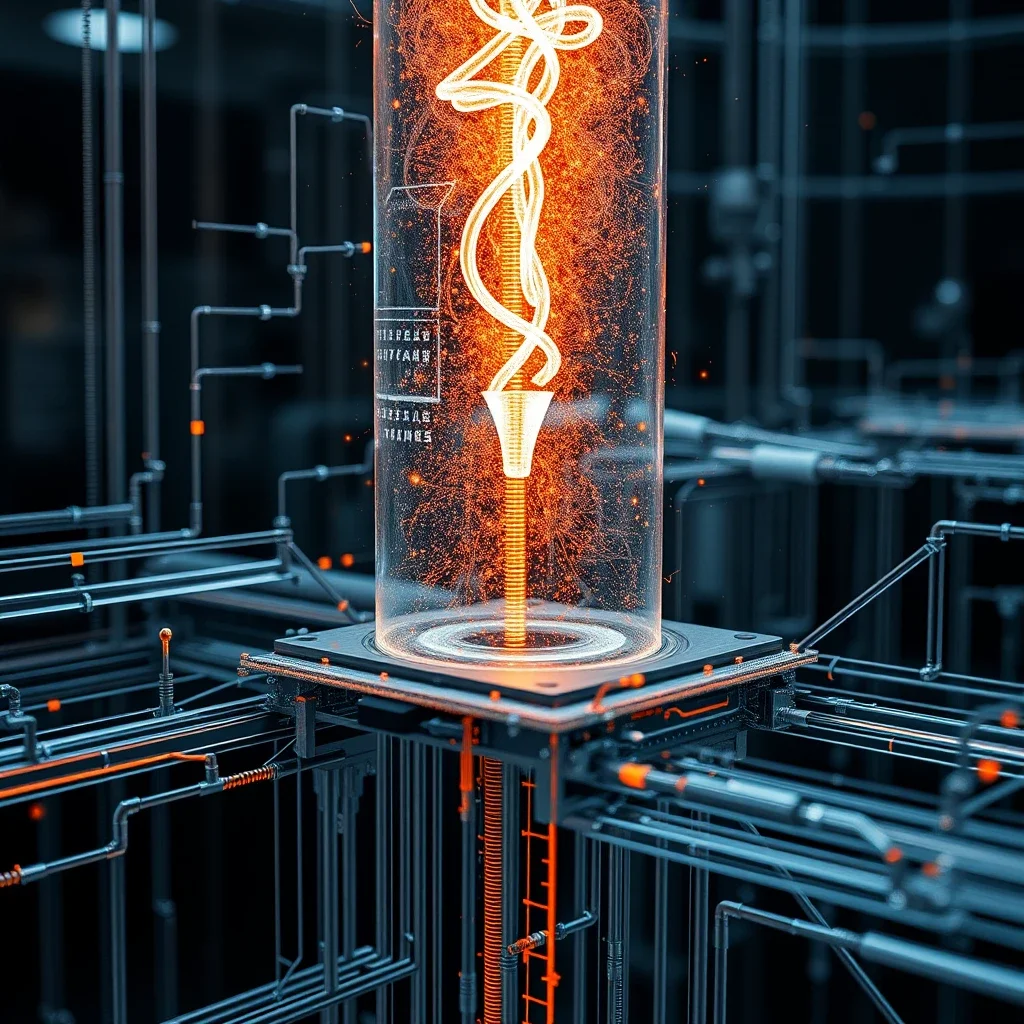 Ein wissenschaftliches Experiment mit einer leuchtenden, spiralförmigen Energiequelle in einem transparenten Behälter, umgeben von komplexen technischen und elektronischen Komponenten.